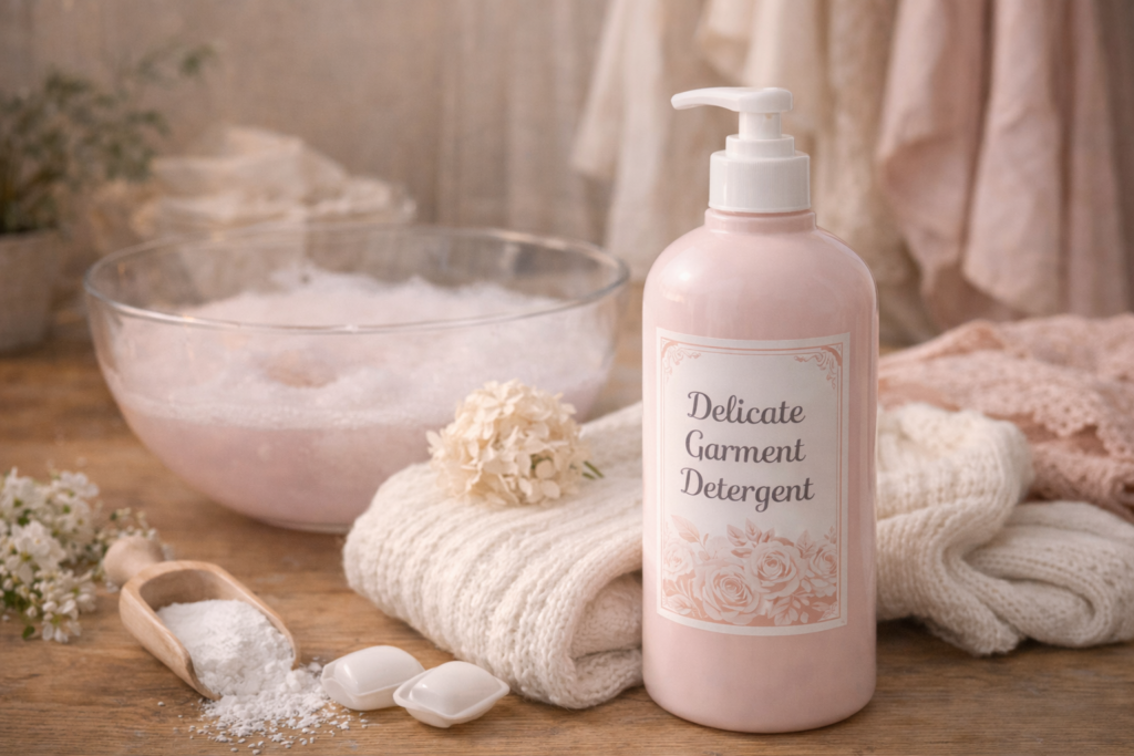 おしゃれ着洗剤が想定している衣類は、薄手のブラウスやニット、レース素材、落ち感のあるワンピースなど、形や質感が印象を左右するものが中心です。こうした衣類は、強い摩擦や急激な水流によってシルエットが崩れやすく、洗濯後の変化が着用時の印象に直結します。そのため、おしゃれ着洗剤は洗濯工程全体を穏やかに進めることを前提とし、洗剤自体も衣類との関係性を意識した存在として位置づけられています。