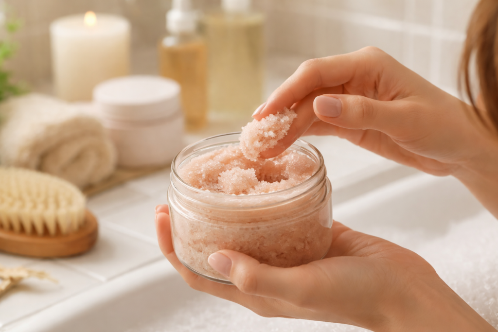 使い続けるためには、視界に入る場所に置くこともひとつの工夫です。バスルームの取り出しやすい位置や、いつものボディソープの近くに置くだけで、「ついでに使う」という選択肢が生まれます。わざわざ取り出す手間があると、それだけで使用のハードルは上がります。動線に馴染ませることで、スクラブは特別な存在ではなく、日用品のひとつとして扱いやすくなります。